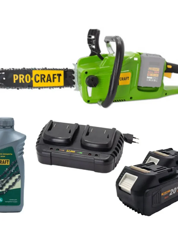 Акумуляторна ланцюгова пила Procraft PCA40/2 з двома акумуляторами 20 В 8 А·год та зарядним пристроєм — потужний і універсальний інструмент для обрізання гілок, заготівлі дров, садових і будівельних робіт. Сумісна з платформою Procraft 20 В.