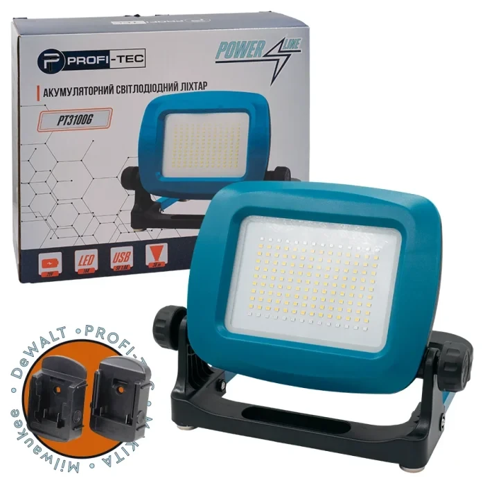 PROFI-TEC PT3100G POWERLine — потужний акумуляторний прожектор для професійного та побутового використання. Забезпечує яскраве, рівномірне освітлення робочих зон без підключення до електромережі
