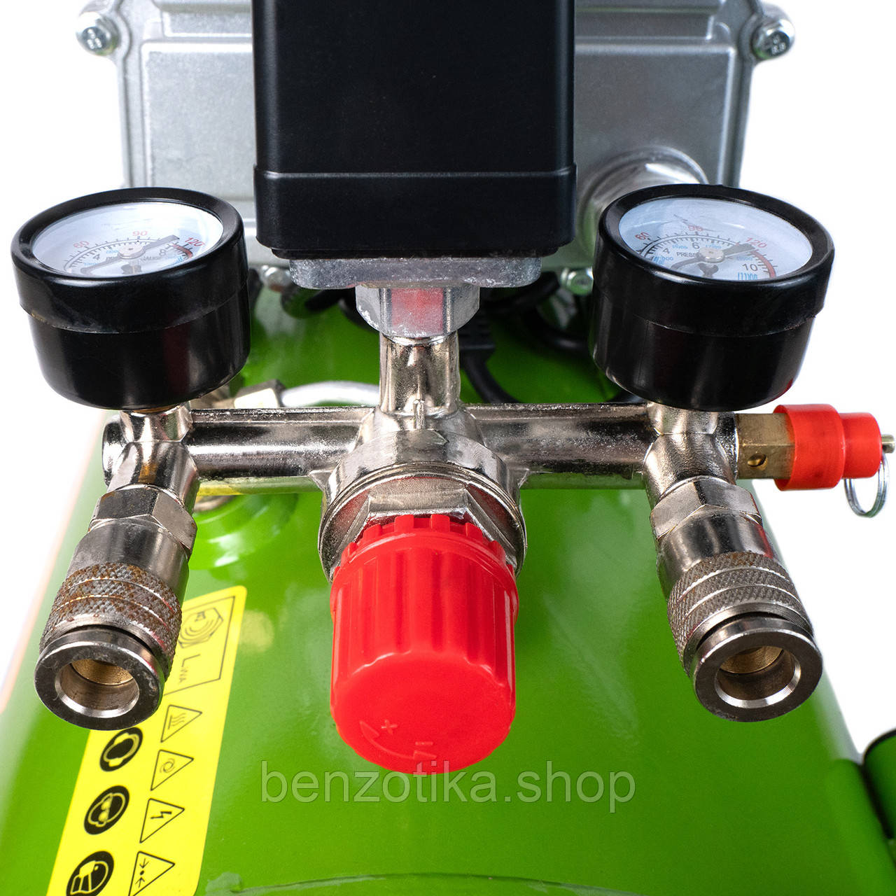 Компресор оснащений захистом від перевищення тиску, стійкою конструкцією та зручний у транспортуванні завдяки колесам і гумовій опорі.