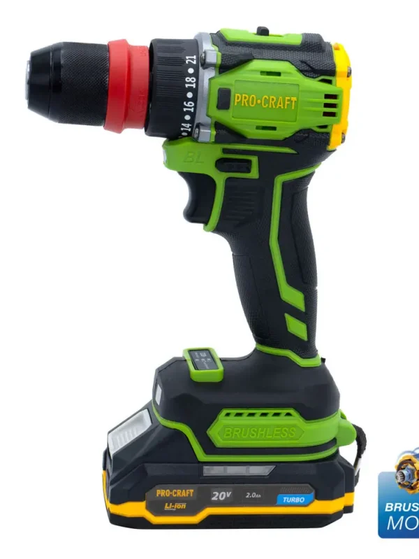 Procraft PA18Pro DFR — надійний акумуляторний шуруповерт з безщітковим двигуном та швидкознімним металевим патроном. Призначений для свердління та закручування кріплення у дереві та металі, підходить для побутових і напівпрофесійних робіт